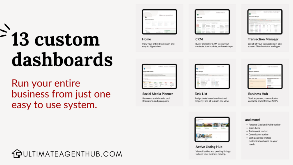 Ultimate Agent Hub is the new command center for your real estate business. Master your CRM, organize tasks, and track commissions—all in one easy-to-use Notion system.